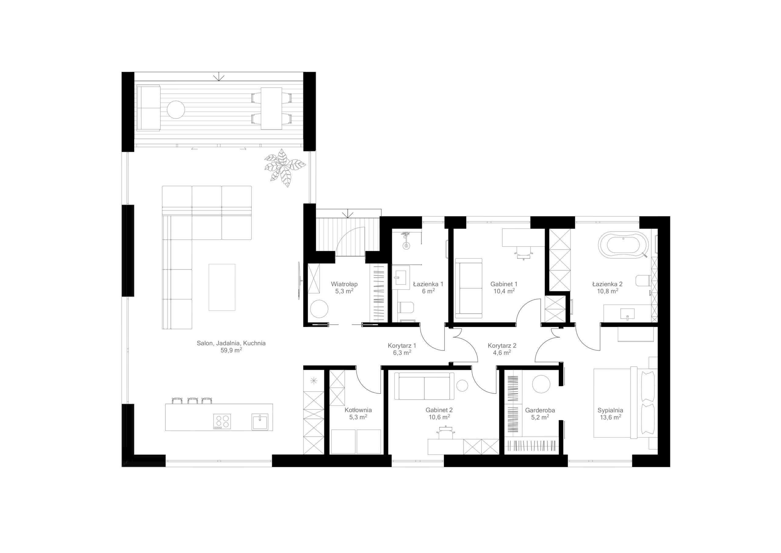 Serce domu stanowi salon z jadalnią i kuchnią – otwarte, jasne wnętrze z bezpośrednim wyjściem na taras. Część prywatna obejmuje sypialnię główną z garderobą, dwie dodatkowe sypialnie lub gabinety, a także dwie łazienki, co podnosi komfort codziennego użytkowania.