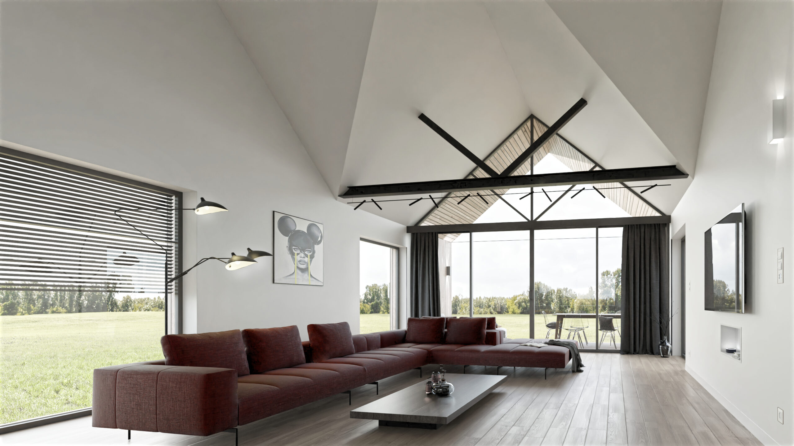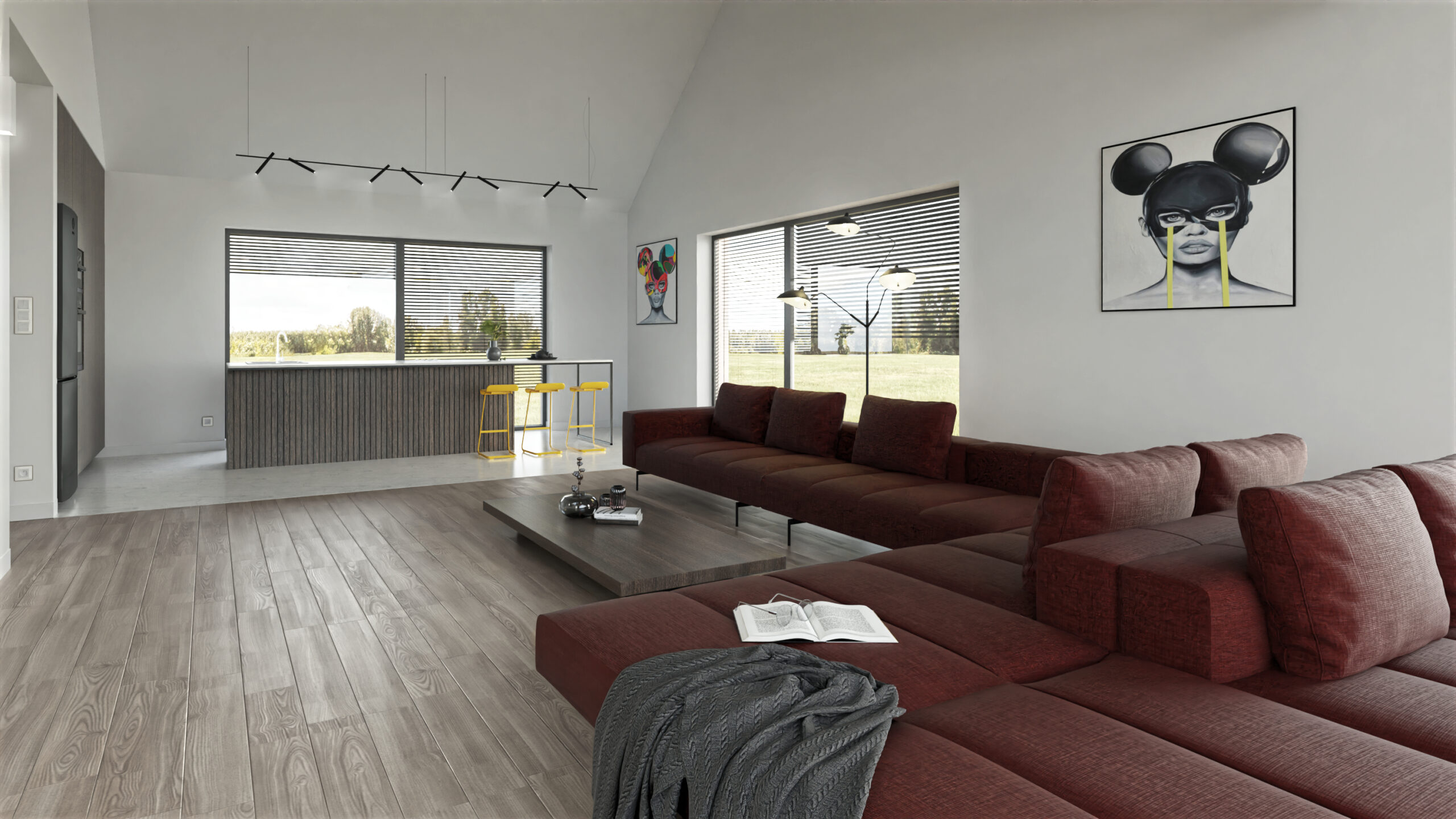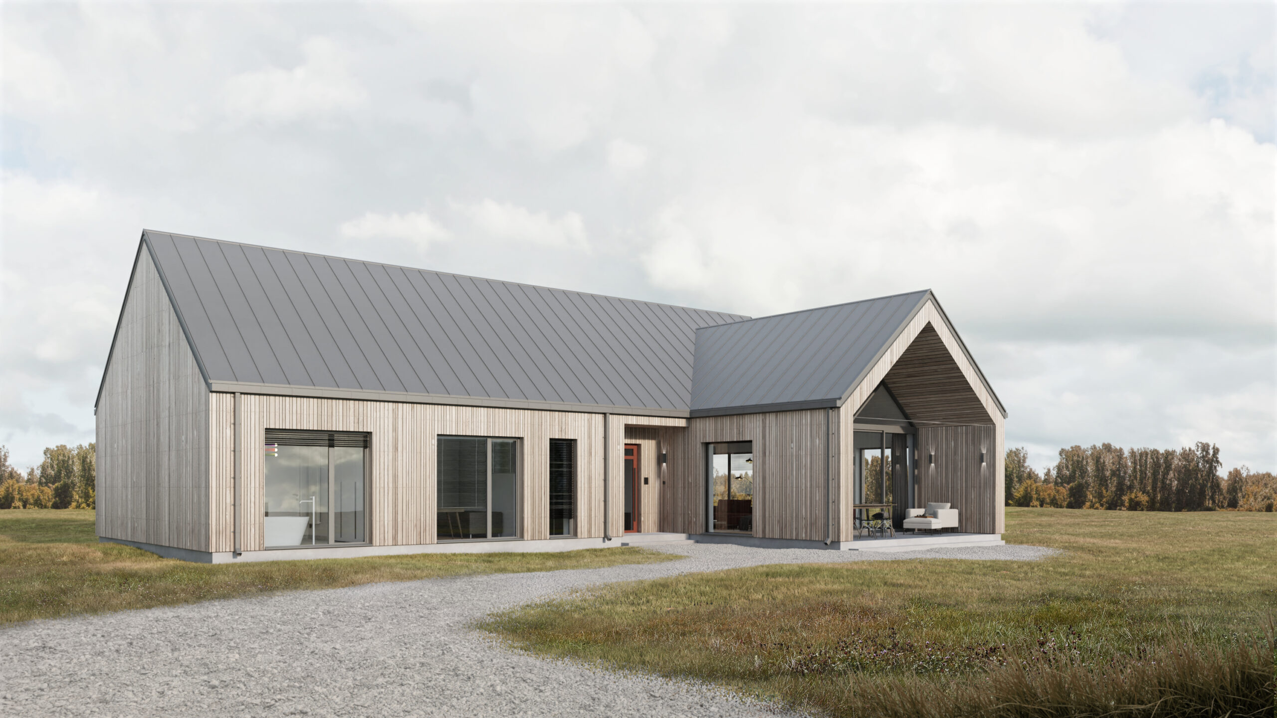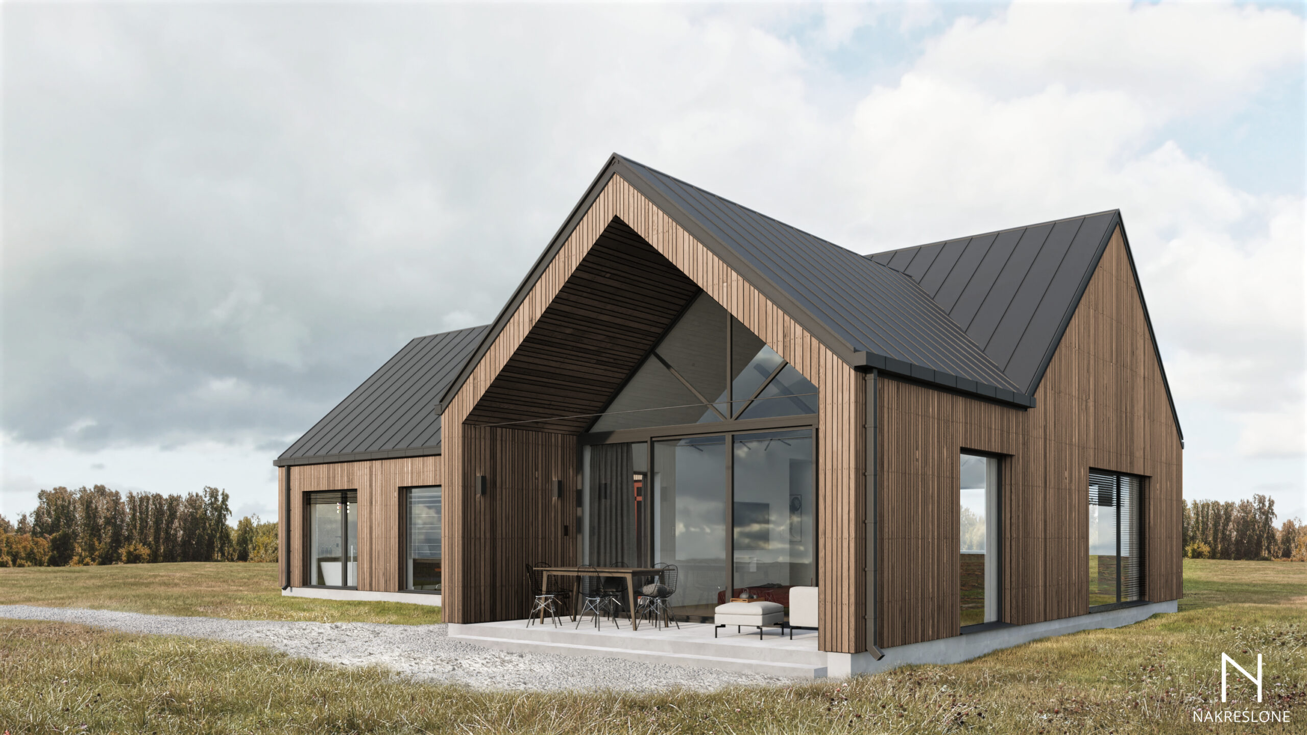 Dom wyposażono również w kotłownię, przestronny wiatrołap i dwa funkcjonalne korytarze, zapewniające wygodny dostęp do wszystkich pomieszczeń. Prosta bryła, duże przeszklenia i naturalne materiały wykończeniowe podkreślają jego skandynawski charakter.