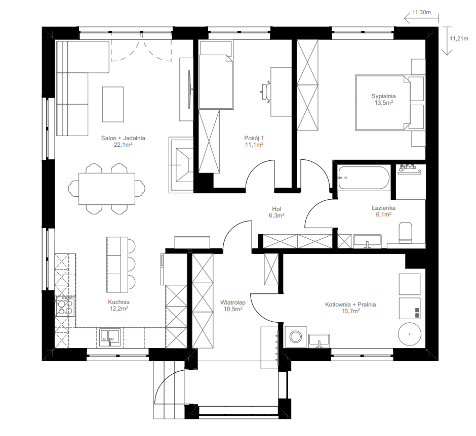 W środku zaplanowano wyraźny podział na strefę wspólną i prywatną. Salon z jadalnią (22,1 m²) tworzy najważniejsze miejsce domu – przestrzeń spotkań, odpoczynku i codziennych rytuałów. Z salonem współgra otwarta kuchnia (12,2 m²), która dzięki swojemu układowi oferuje dużo blatu i miejsca do przechowywania.
