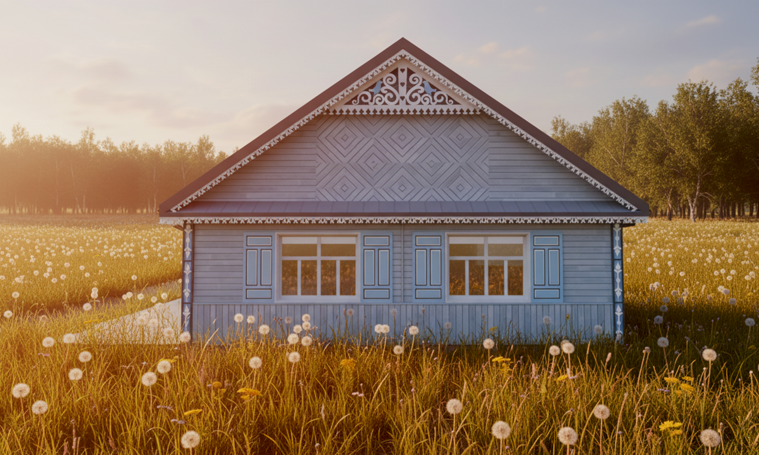 Bryła domu jest prosta, zwarta, przykryta dwuspadowym dachem. Detale – ozdobne listwy, rzeźbione szczyty, pastelowe okiennice – nadają mu lekkości i przywołują klimat dawnych podlaskich wsi. Duże przeszklenia od strony ogrodu otwierają wnętrze na naturalne światło i pozwalają w pełni korzystać z tarasu, który staje się przedłużeniem części dziennej.